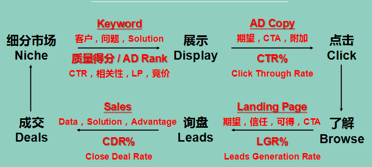 張老師的課程是圍繞海外市場(chǎng)營銷展開的,市場(chǎng)營銷是一個(gè)從找到細(xì)分市場(chǎng)開始的螺旋式上升的結(jié)構(gòu),從細(xì)分市場(chǎng)開始,找到能響應(yīng)客戶痛癢的關(guān)鍵詞,出現(xiàn)在客戶響應(yīng)客戶痛癢的第一現(xiàn)場(chǎng),通過有吸引力的文案來吸引客戶點(diǎn)擊,最后從五遵守五個(gè)因素來建立著陸頁,提高轉(zhuǎn)化率,最后進(jìn)入銷售環(huán)節(jié),從這一系列流程中不斷地強(qiáng)化、更新細(xì)分市場(chǎng),如此循環(huán)往復(fù)周而復(fù)始。